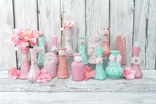 I have seen these little bottle vignettes done all in white with cast off glasses and love it more than this color one, but I do think this is lovely. I plan on doing a white one or all pink with some of my vases and cast off glasses soon. I think it's just lovely. I think having them all the white color would pull them together more.